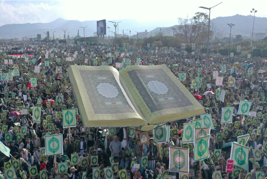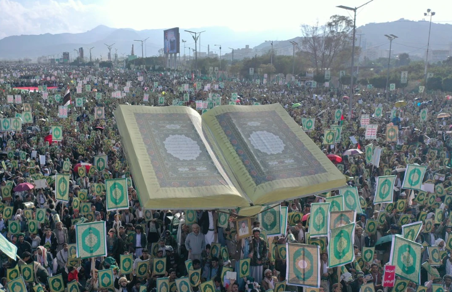 With massive crowds, Yemenis took to the streets in Sana’a and other governorates, carrying the Holy Quran in their hands and brandishing their weapons against the American-Zionist enemy, warning of the consequences of its repeated offenses against the most sacred Islamic sanctity—the Holy Quran.